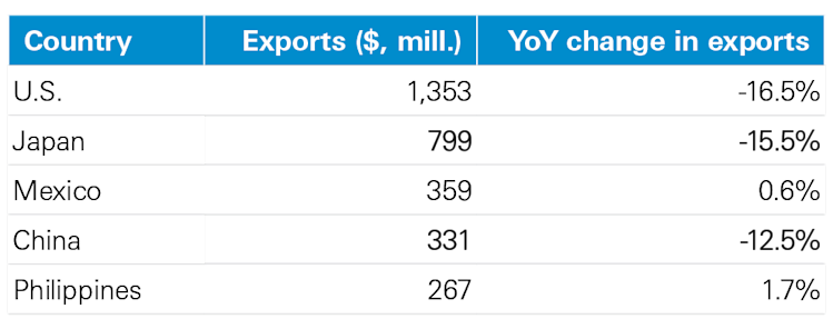 Pork exports were down -7.0% in 2023. The U.S. is also the most important market for pork exports, though less so than beef. Exports were down in three of Canada's top five pork markets in 2023, reflecting the pork production struggles at home and the global glut of pork.
