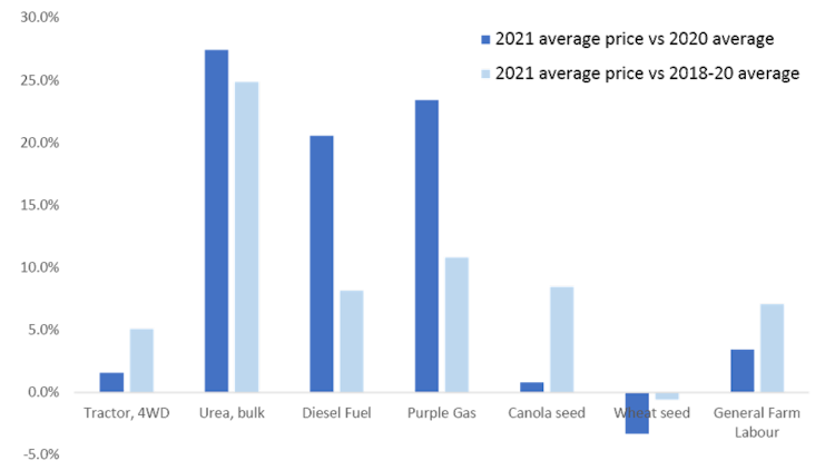 However, while the YoY gains for fertilizer and energy were more pronounced than their respective three-year averages, four-wheel-drive tractors, canola seed and general farm labour were more expensive in 2021 than they averaged between 2018 and 2020. Wheat seeds were slightly cheaper last year than in 2020, and the average of 2018-2020.