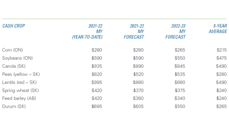 Table 1: 2021-22 and 2022-23 crop prices ($/tonne) well ahead of 5-year average (‘16-‘17 to ‘20-‘21)