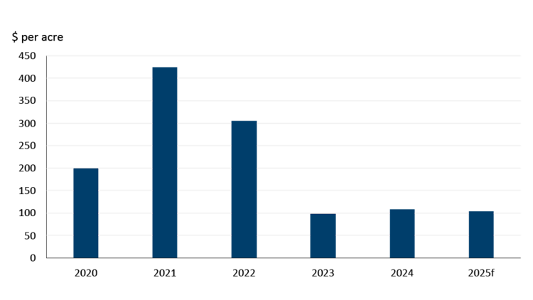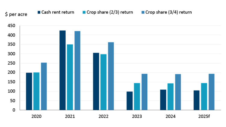 In Ontario, 2025 projections show that it will be the third year of reduced profits for a corn-soybean rotation under a cash rent agreement (Figure 2). While returns on average will vary depending on individual producer land costs, including land that was either recently purchased or is rented, it appears next year will be another lean year.