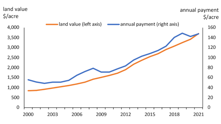 Farmland values and annual payments tend to evolve at the same pace (Figure 1). Over the past 10 years, farmland values have increased on average 7.9% per year, while average annual payments have increased 6.6% per year. The influence of rising land values in 2021 on annual payments was moderated somewhat by declining interest rates.
