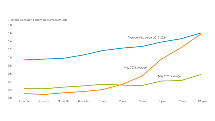The Bank of Canada lowered its overnight rate at the outset of the pandemic to its effective lower bound at 0.25%. As a result, the prime rate came down to 2.45% from 3.95% in 2019. Lower overall rates have resulted in a 6.5% increase in total borrowing across the country. Long-term bond yields have increased in 2021 as the economic recovery gains traction and inflation ramps up (Figure 1) even as the Bank of Canada is committed to keeping its overnight rate at 0.25% into 2022.