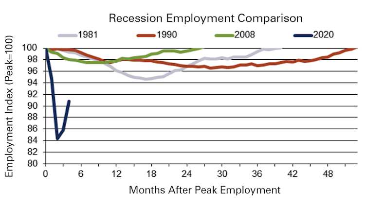 Quick recovery in employment is doubtful. The recent Bank of Canada business outlook survey reported that nearly 60% of businesses expected employment to return to pre-COVID-19 levels in the next 12 months. A rebound in sales will trigger an initial surge in job creation, but employment should then rebound at a rate more comparable to the past recession. So an initial V-shaped rebound in employment may soon be followed by a slower pace of employment growth as some businesses struggle under a new economic reality.