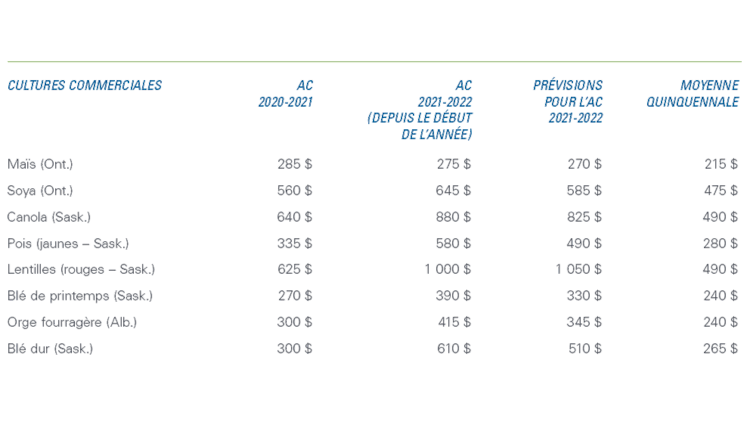 Tableau 1 : Prix des cultures de 2021-2022 ($/tonne) en hausse par rapport à l’année précédente et bien supérieurs à la moyenne quinquennale