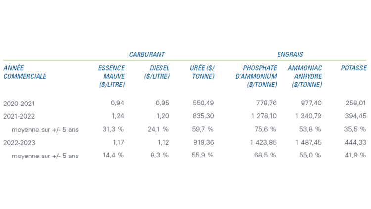 Les prix des intrants agricoles, qui devraient continuer à augmenter tout au long de l’AC 2021-2022 et poursuivre leur ascension pendant l’AC 2022-2023 (tableau 2), augmentent la pression sur la rentabilité. La hausse fulgurante des prix du carburant devrait ralentir graduellement au cours de l’AC 2022-2023, mais les prix de l’essence mauve et du diesel seront plus élevés cette année — environ 31,3 % et 24,1 % respectivement — que la moyenne quinquennale la plus récente (de 2016-2017 à 2020-2021). En comparaison, entre cette campagne agricole et la prochaine, les prix des engrais devraient continuer à augmenter en suivant leur rythme actuel (ammoniac anhydre, urée et phosphate) ou pourraient bondir à nouveau après une pause (potasse).