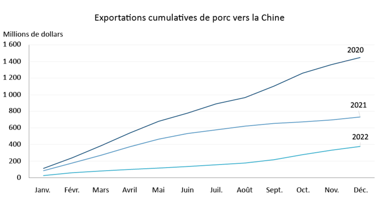 La production canadienne de porc devrait rester stable et se maintenir aux niveaux de 2022. Compte tenu de la chute rapide des exportations canadiennes vers la Chine en glissement annuel (figure 2), les fournisseurs canadiens vont devoir trouver de nouveaux acheteurs sur d’autres marchés.