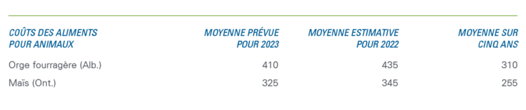 La solidité des prix explique en grande partie pourquoi nous prévoyons en 2023 des marges bénéficiaires élevées pour le secteur de l’élevage-naissage, qui dépasseront les bonnes marges générées en 2022. Encore une fois, les coûts des aliments pour animaux compromettront la rentabilité du secteur de l’engraissement, surtout pour les exploitations qui achètent des aliments. Les coûts des aliments pour animaux sont en baisse par rapport aux sommets de l’année dernière, mais ils dépassent encore facilement la moyenne sur cinq ans (tableau 2). Dans l’ensemble, le secteur devrait constater une amélioration en glissement annuel.