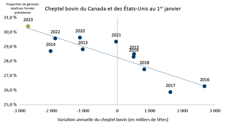 Au cours de la dernière année, les producteurs du Canada et des États-Unis ont envoyé un nombre accru de génisses à l’abattage en raison de la sécheresse qui sévissait aux États-Unis et des coûts extrêmement élevés des aliments pour animaux. Depuis 2020, l’abattage de génisses représente plus de 29 % de l’abattage total, un niveau qui provoque la contraction de la taille du cheptel l’année suivante. En 2022, la proportion de génisses abattues a atteint 30,4 %, un sommet jamais vu en dix ans, et s’est approchée du niveau record de 32 % enregistré en 2004.