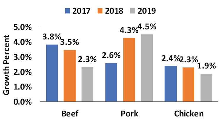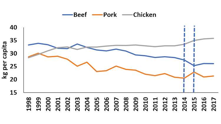 Per capita red meat consumption has been on a downward trend for the last two decades. Between 1998-2017, per capita beef and pork consumption declined 21% and 26% respectively while chicken consumption increased 26%.