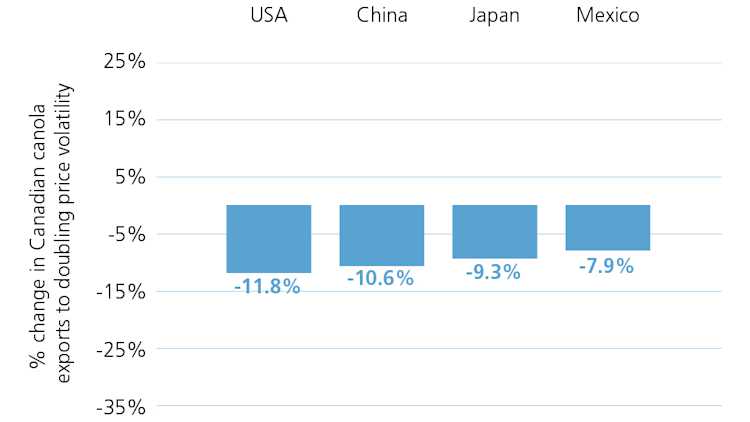 Canada’s overall canola exports decline in months when volatility in canola prices increases. To understand how, let’s assume that volatility in the export price of canola doubles over a 12-month horizon. This is large shift that rarely occurs. But it is useful to understand how volatility works. In this case, the response of Canadian canola exports would be uniform among key markets, with losses in exports ranging between 7.9% (Mexico) and 11.8% (the U.S.).
