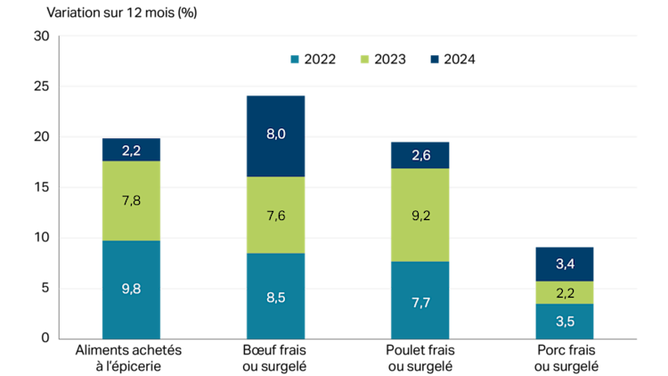 Malgré la hausse des prix, la viande demeure un produit de base dans le panier des Canadiens; elle représente la catégorie de dépense la plus importante au chapitre des produits alimentaires. Cela s’explique à la fois par le fait que les prix de la viande sont généralement plus élevés que ceux des autres catégories, mais aussi par la volonté de longue date d’inclure la viande dans les régimes alimentaires.