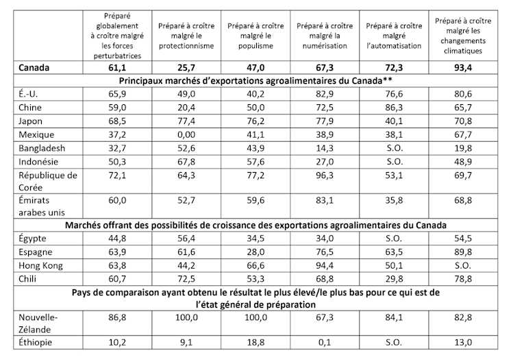 Enfin, le Mexique, le Bangladesh et l’Égypte sont moins bien préparés que la plupart des pays. Or, ce sont des marchés clés pour les exportateurs canadiens de nos produits agroalimentaires se classant en tête de liste (blé, graines et huile de canola, soja, légumineuses, porc, bœuf, pain et pâtisseries). Les répercussions des cinq forces perturbatrices sur chacune de ces économies auront une incidence déterminante sur les entreprises de chez nous.